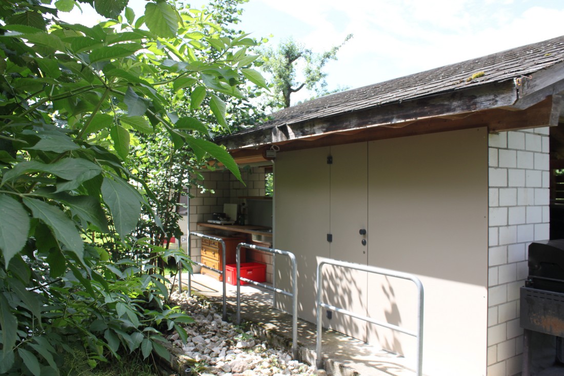 Das WC und die Dusche befinden sich im Aussenbereich, respektive in einem Nebengebäude gleich hinter dem Spycher. Die Kochnische befindet sich ebenfalls im Aussenbereich und besteht aus zwei elektr. Kochplatten und einem Spülbecken inkl. Warmwasser (Boiler). Kochgeschirr/ Utensilien sind vorhanden.