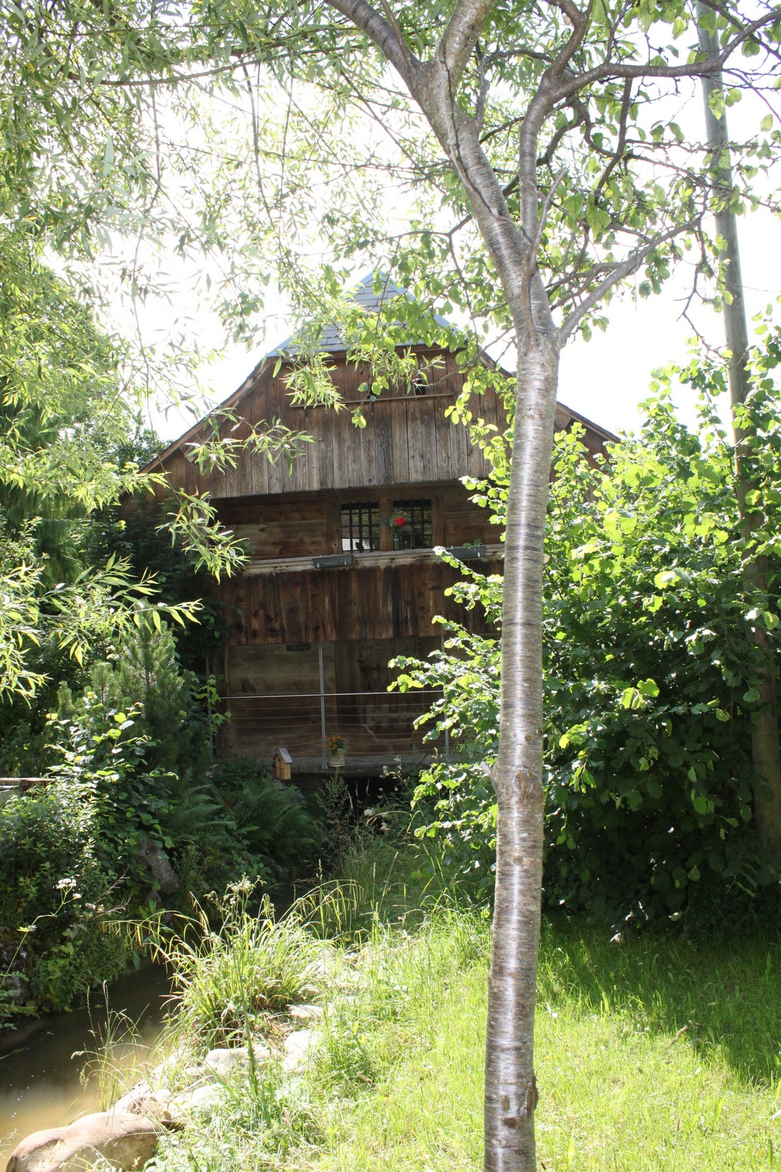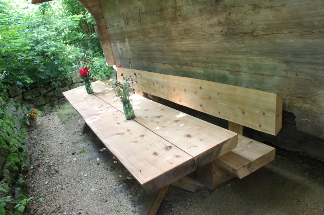 Das idyllische Plätzchen hinter dem Spycher lädt zum Verweilen ein. An dem grossen Holztisch kann die selbst zubereitete Mahlzeit genossen werden und dabei mit Glück noch das Zirpen der Grillen und das Vogelgezwitscher belauscht werden. An heissen Tagen dürfen gerne die Füsse in den wunderbar kühlen Bach getaucht werden.