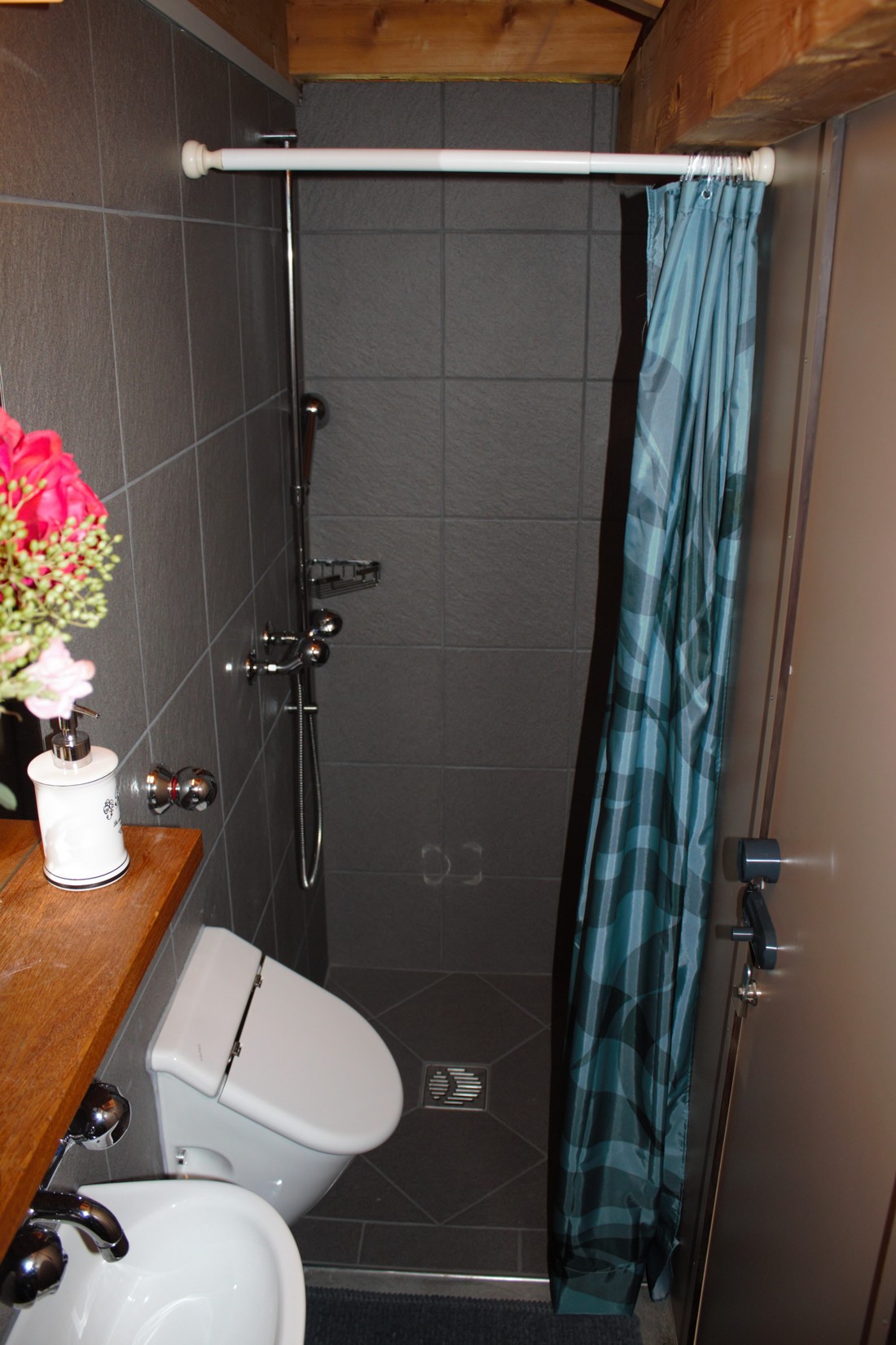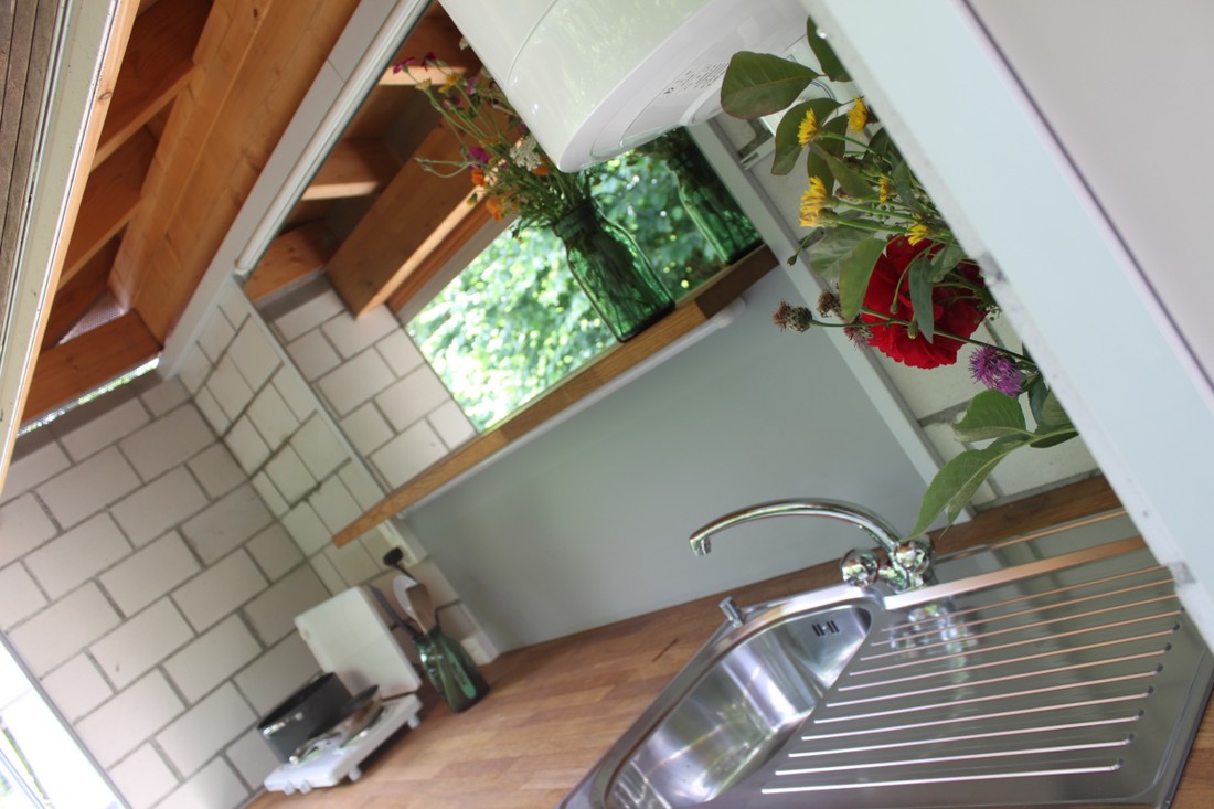 Das WC und die Dusche befinden sich im Aussenbereich, respektive in einem Nebengebäude gleich hinter dem Spycher. Die Kochnische befindet sich ebenfalls im Aussenbereich und besteht aus zwei elektr. Kochplatten und einem Spülbecken inkl. Warmwasser (Boiler). Kochgeschirr/ Utensilien sind vorhanden.