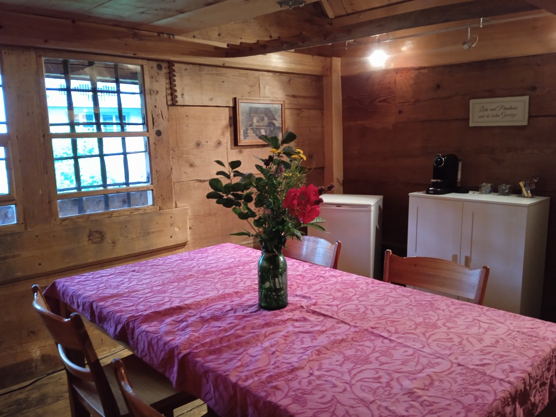 Das Bächli fliesst unter dem Mühlispycher durch.Von euch können die obere zei Etagen genutzt werden. Das Wc und die Kochgelegenheit befinden sich ausserhalb des Spychers.Weiter kann ein grosser langer Holztisch genutzt werden um die Natuir draussen so richtig zu geniessen.